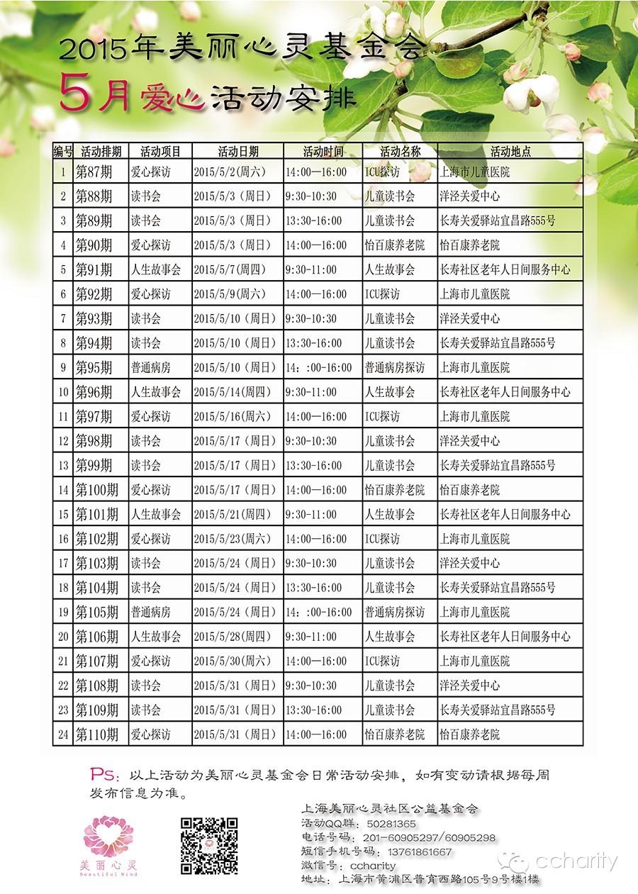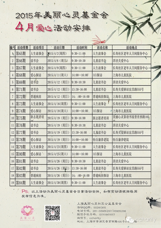 注:所有报名参加的志愿者必须接受过美丽心灵志愿者的入门培训
