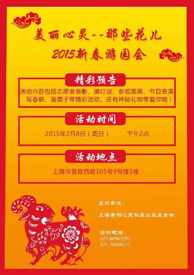 2015年春节将至,为回馈社区居民和志愿者对社区公益事业的支持。上海美丽心灵社区公益基金会将开展主题为“美丽心灵—那些花儿,2015新春游园会”的活动。